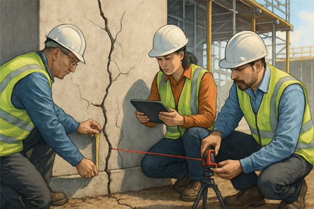 Measure crack width and monitor changes over time using a crack gauge. Expanding cracks indicate active issues that likely require professional intervention.