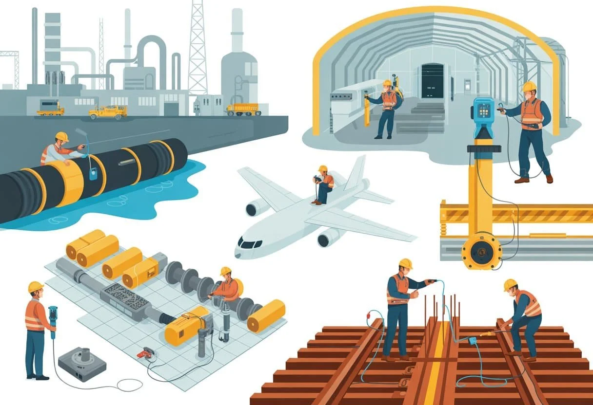 Engineers use NDT to evaluate welds, concrete structures, aircraft components, and pipeline systems. The testing occurs during manufacturing, construction, and regular maintenance cycles.