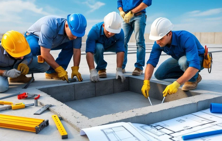 For mat or raft foundations, the process involves preparing a level surface, installing reinforcement in layers, and placing concrete in planned sections to control shrinkage and thermal stresses.